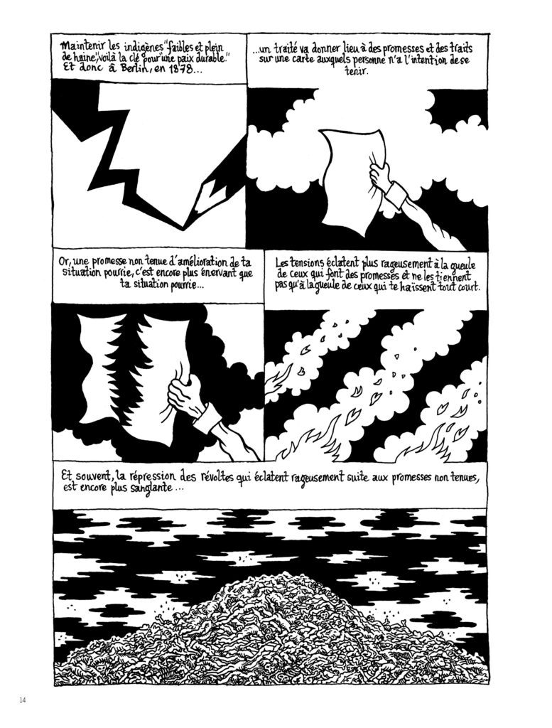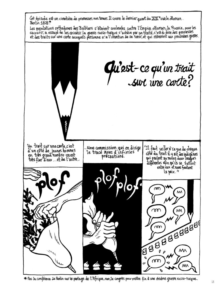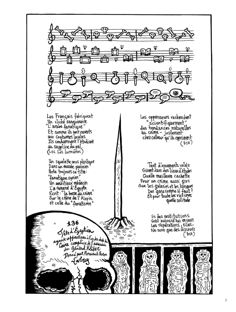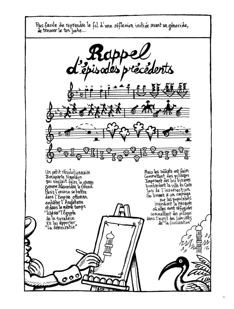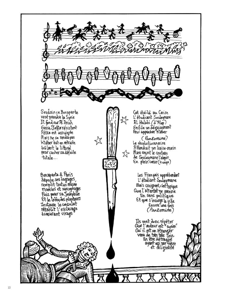 Pour rappel: Décris-Ravage, c’est tout d’abord une pièce de théâtre d’Adeline Rosenstein, une pièce qui s’inscrit dans la mouvance du théâtre dit documentaire. Dans la pièce, comme dans sa mise en image, il est question de la Palestine et du rapport compliqué et conflictuel entre l’Occident et le Moyen-Orient. Documentée et érudite, la pièce est devenue une bande dessinée à nulle autre pareille, grâce à une collaboration étroite entre Adeline Rosenstein et Alex Baladi, dépassant ainsi nettement le cadre de la simple adaptation.