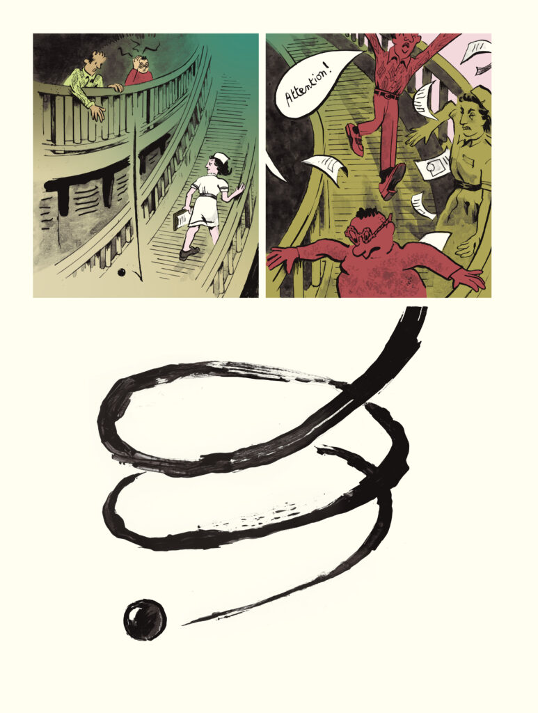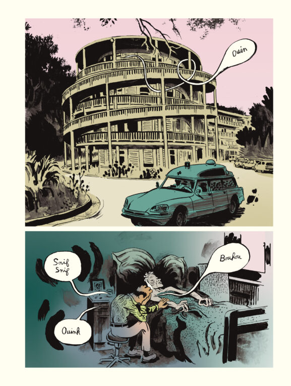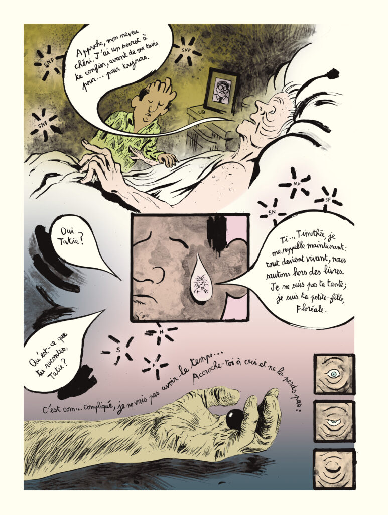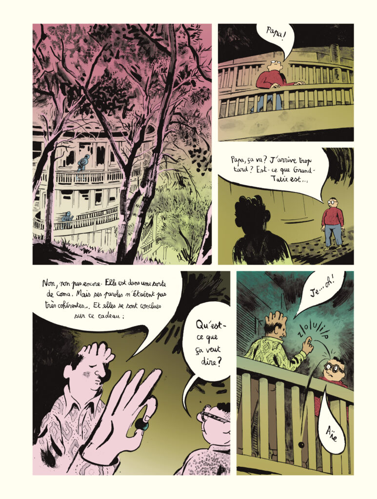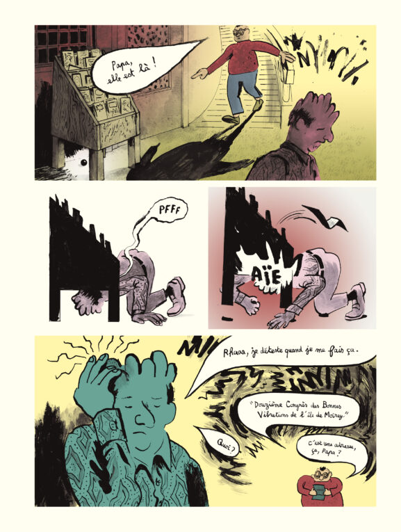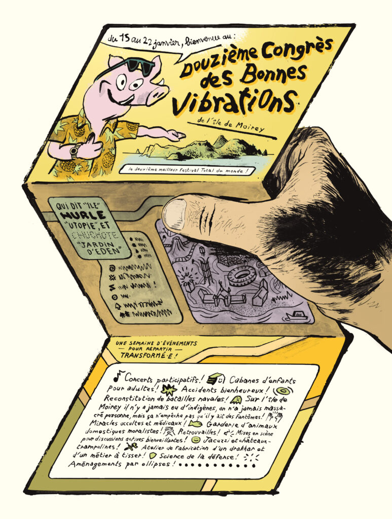 Ce Douzième congrès des bonnes vibrations marque la rencontre artistique de Thomas Gosselin (au scénario) et Renaud Thomas (au dessin). Ce qui en sort, c’est un livre passablement mouvementé, empli d’énigmes, de recettes, de freaks, d’objets capricieux, mais aussi d’imprévus, de tempêtes et de tourbillons – bref, un livre au climat assurément tropical.