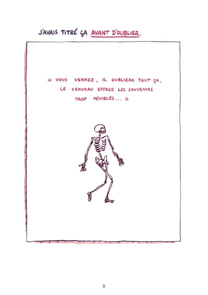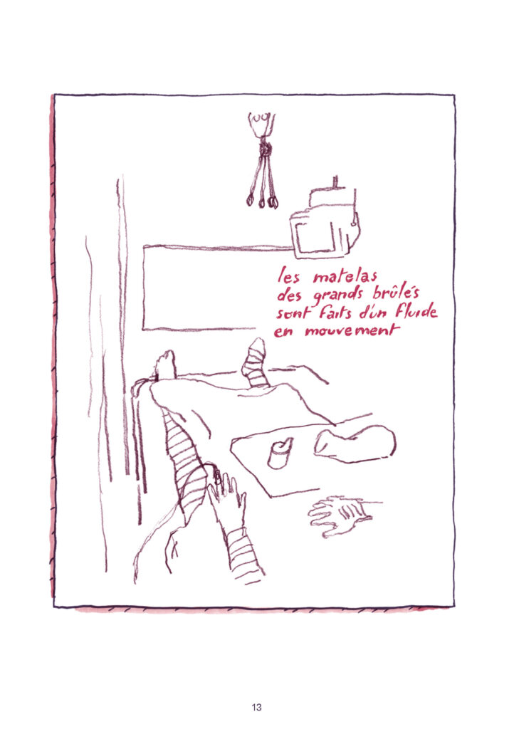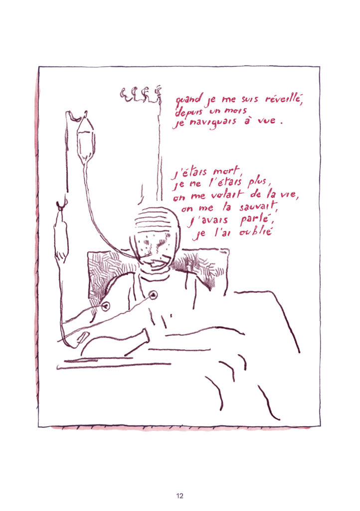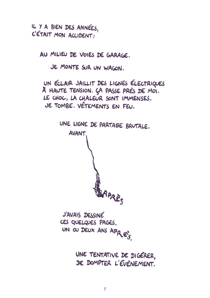 On connaît Benoît Preteseille pour ses bandes dessinées parues chez Atrabile, Biscoto, Cornélius et d’autres maisons d’édition, où il exprime un intérêt certain pour l’art du début du XXe siècle, le dadaïsme, le surréalisme, Fantômas, Boris Vian ou encore Marcel Duchamp. C’est peu dire qu’on ne le voyait pas vraiment investir le terrain de l’autobiographie. Et pourtant… Il y a 25 ans, Benoît Preteseille a été foudroyé sur un train par un arc électrique. Brûlé de part et d’autre au troisième degré, hospitalisé pendant de longs mois, il en a gardé une série de marques et cicatrices, autant de souvenirs indélébiles et aujourd’hui toujours visibles. Si certains accidents, certains traumatismes, viennent blesser l’intérieur d’un être sans que cela soit discernable, la brûlure, elle, abîme la chair pour longtemps, voire pour toujours. Et si Benoît Preteseille a appris à vivre avec ce nouvel état, le regard de l’autre, lui, renvoie sans cesse l’image d’un être qui appartient désormais à une communauté à part, une tribu de « personnes abîmées, bousillées, tordues, ébréchées » et « visiblement pas intactes ».